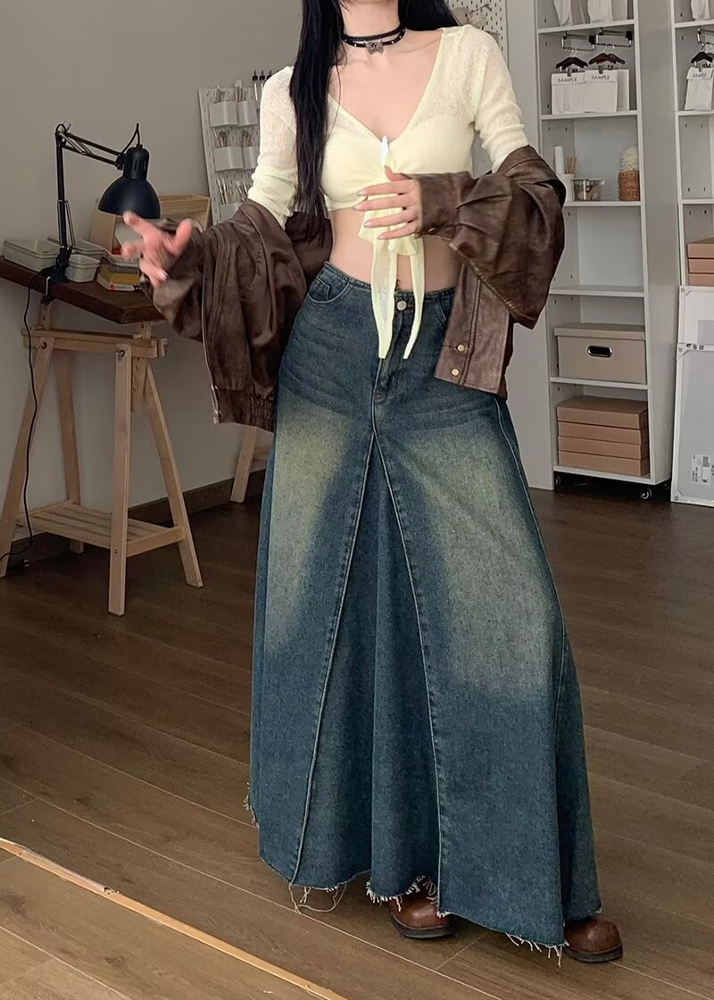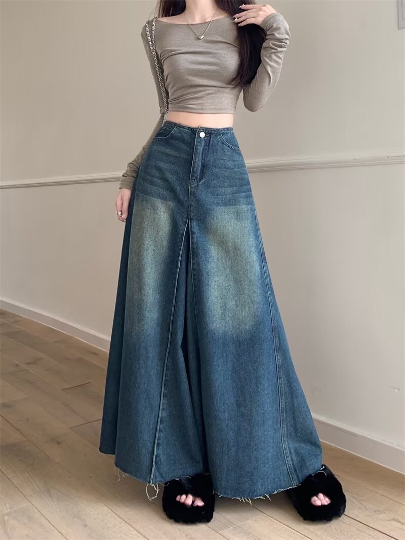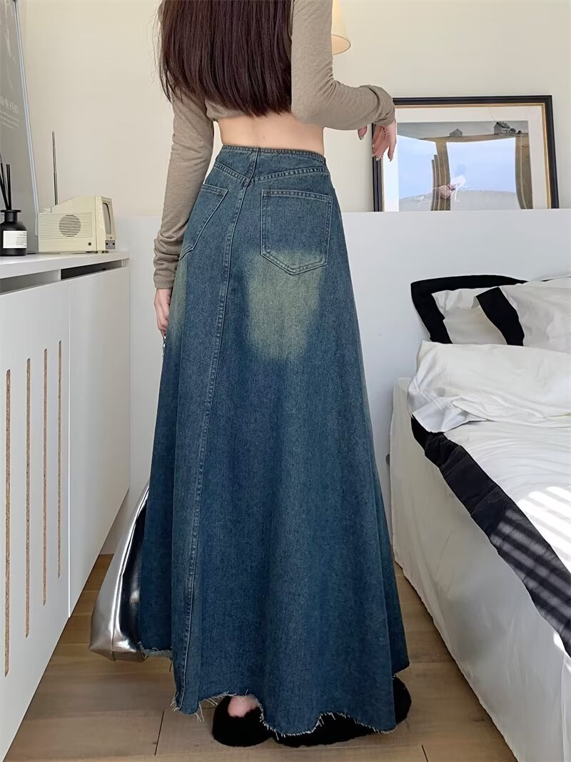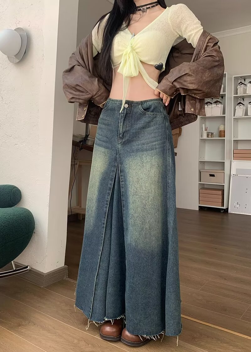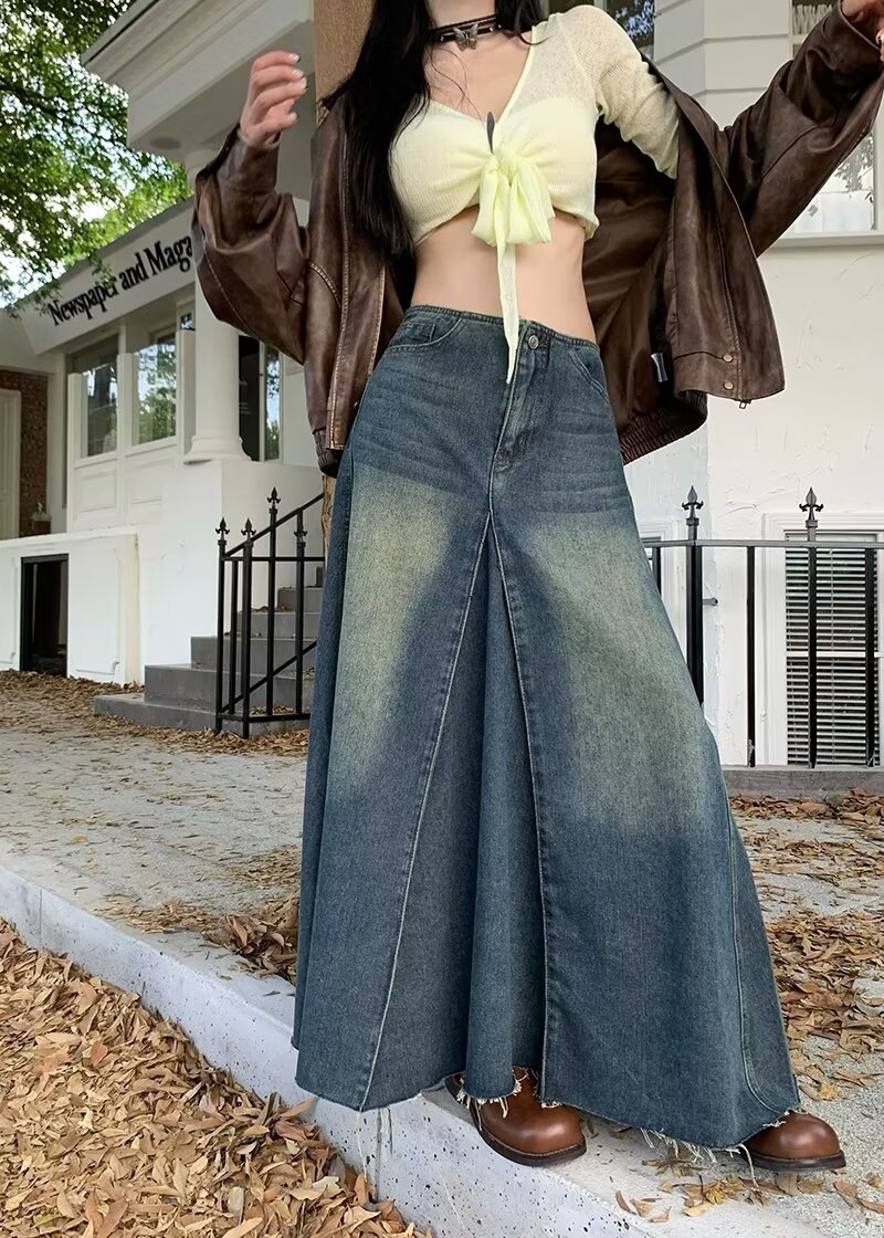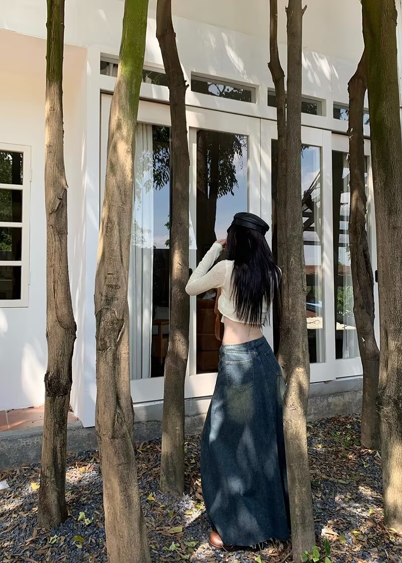 Women's Retro Blue High Waist Slit Denim Skirt