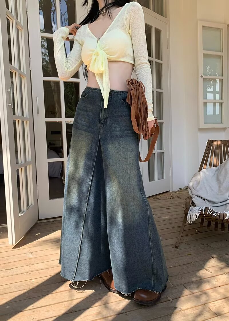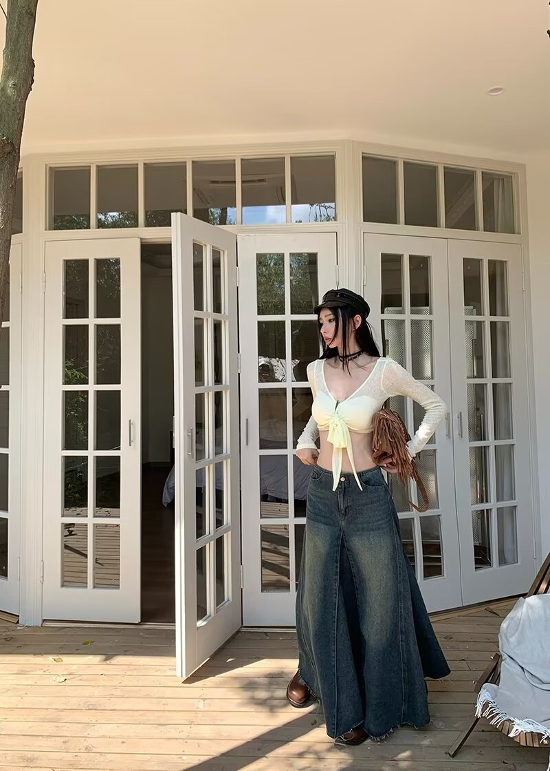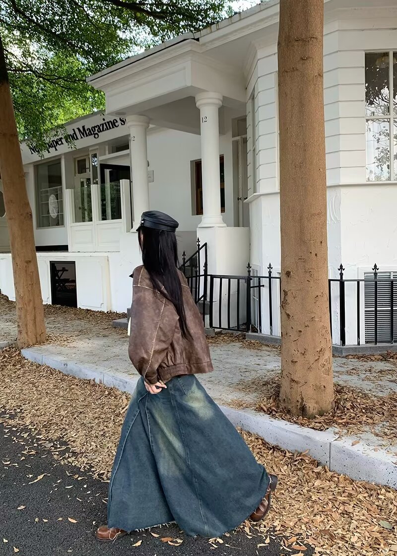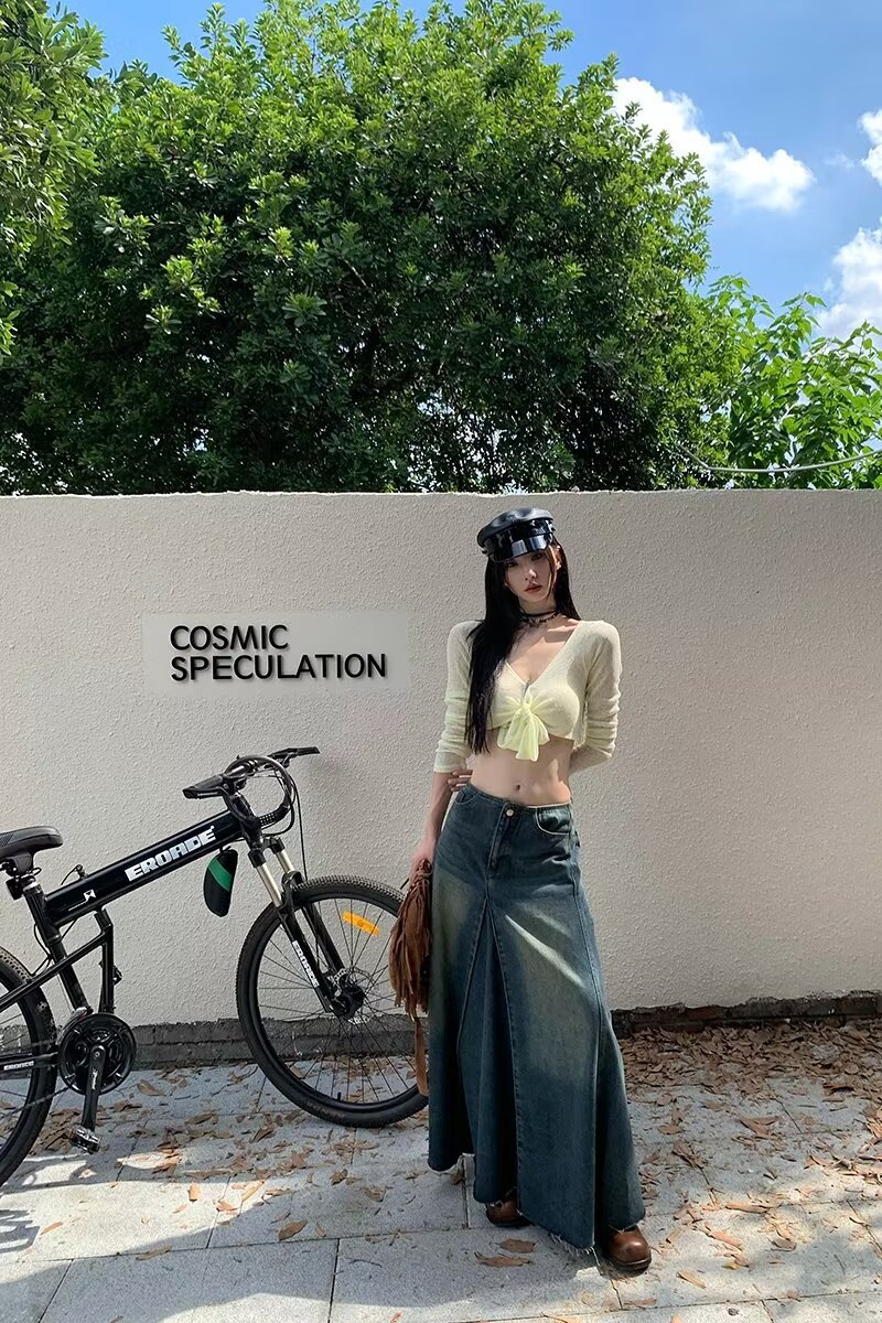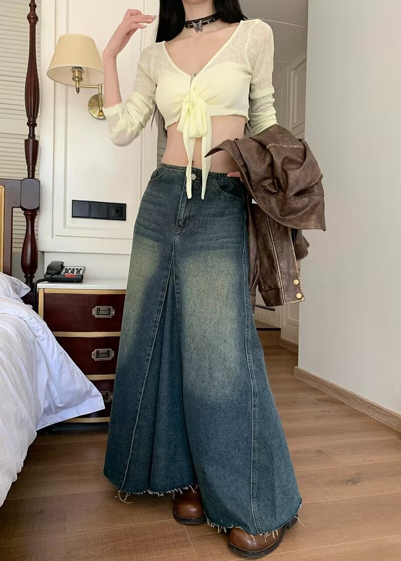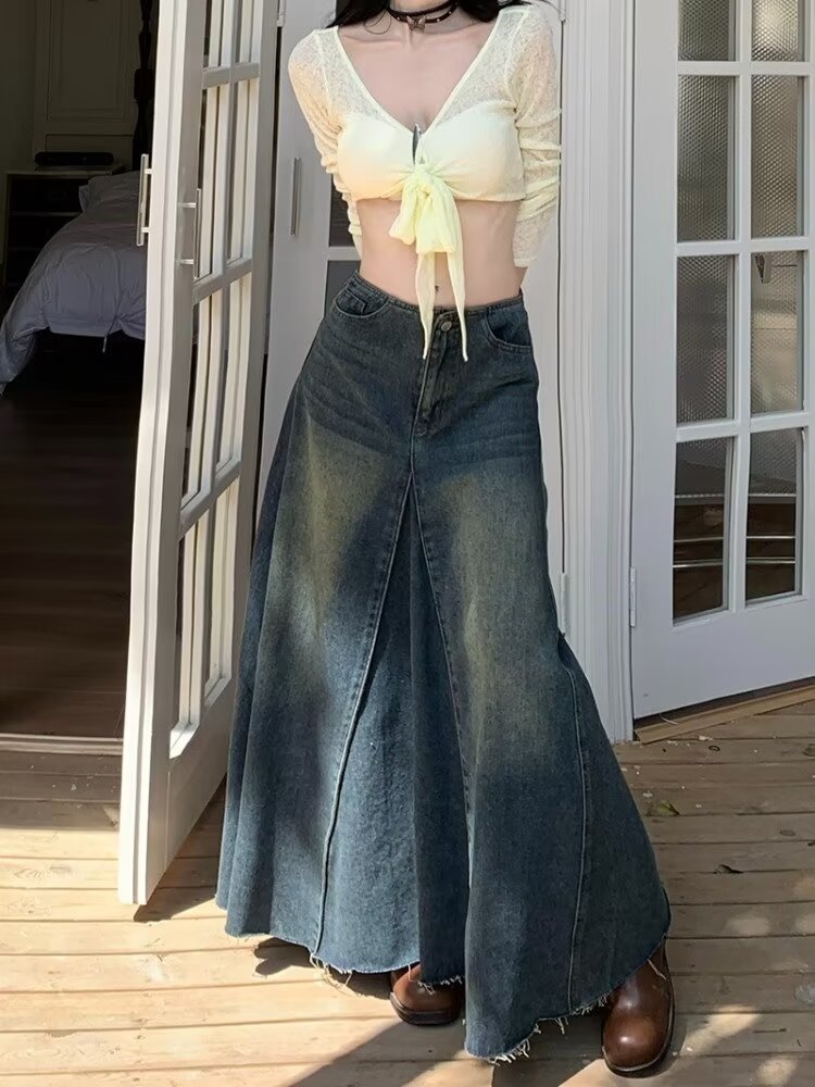 Women's Retro Blue High Waist Slit Denim Skirt